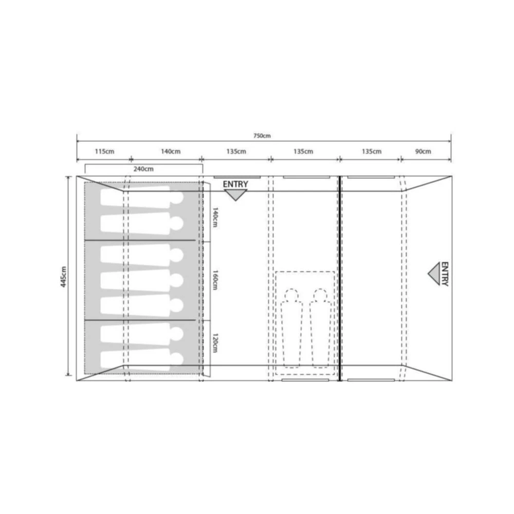 - Versatile Sleeping Quarters:Â A 7-berth sleeping compartment has two optional toggled dividers, to create different bedroom formats, whether a 2/3/2 configuration or an open large bedroom. The bedrooms also have a greater depth of 240cm, which makes them ideal for camp beds or queen-sized airbeds. The sleeping compartments give 60 to 70cm width per person.
