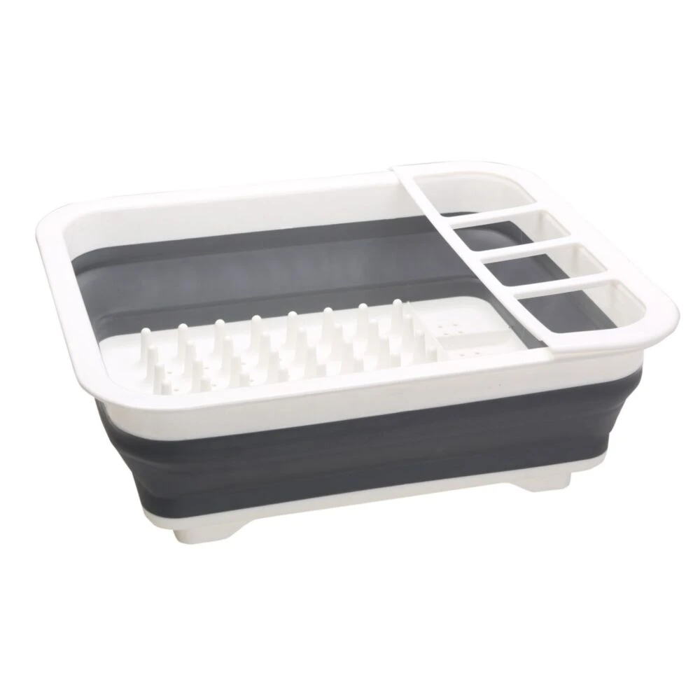An easy-to-use collapsible drainer pops up to hold your freshly cleaned tableware with holes below to drain away water, there is a cutlery holder included to make it easier to keep the cutlery together but this can be removed to give you extra drying space for the larger items. Made from silicone in places for flexibility but it has extra strength and durability with reinforced areas of plastic, making it extra rigid when in use compared to silicone-only products. These materials help keep the product a simple lightweight option that is easy to store away making it an ideal accessory for camping and caravanning, or even in the home.