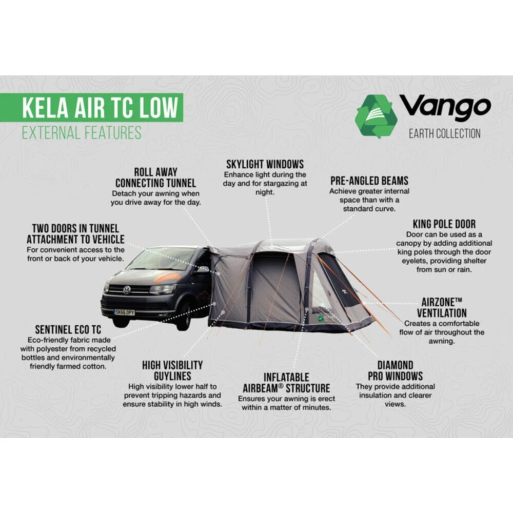 Furthermore, the Kela is an Airbeam design making it very quick, simple, and hassle-free to pitch. Simply attach the Kela to the side of your vehicle, peg the product down, and inflate the AirBeams. A highly popular design by Vango, the TC Kela Air Low awning offers plenty of living space in a simple tunnel design, with a fully sewn-in groundsheet, and a connecting strip for entering the vehicle, with a large connecting panel, complete with two doors.