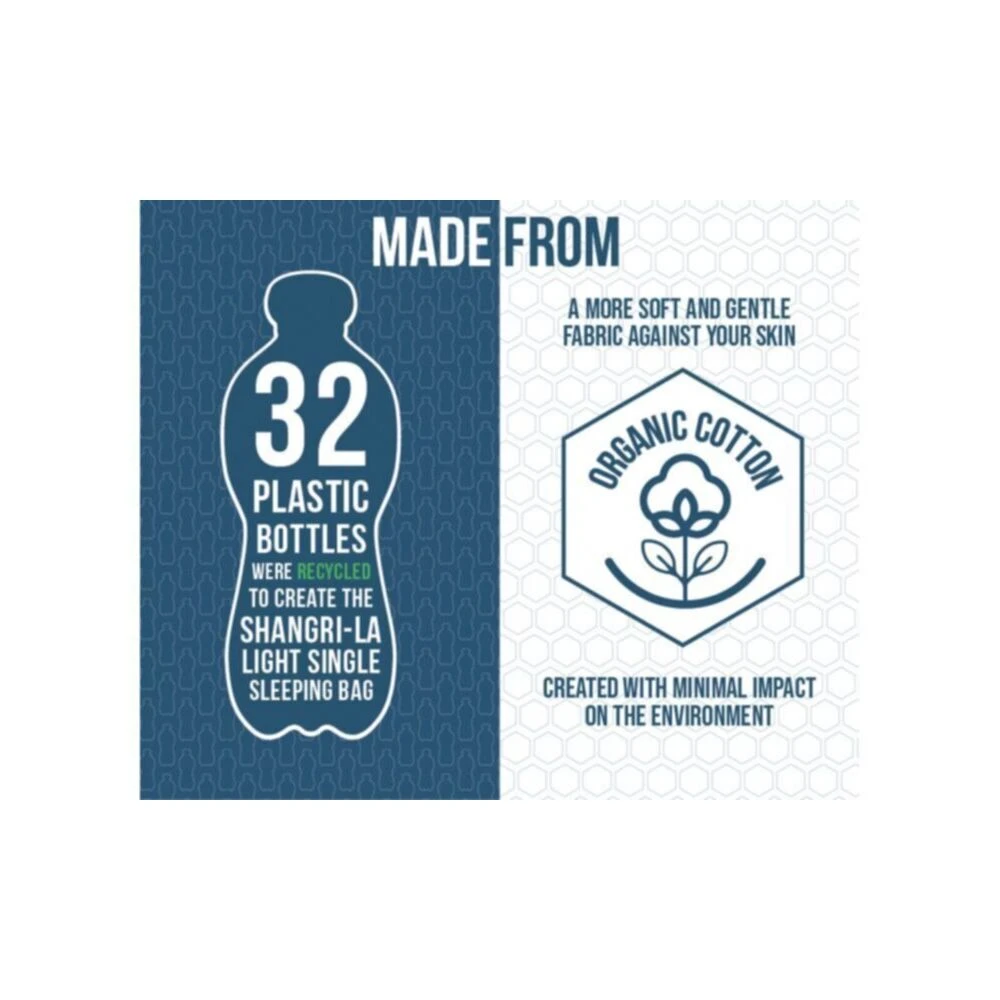 A luxury sleeping bag to match the range of self-inflating mattresses, the Vang Shangri-La Light sleeping bag is a single sleeping bag with organic cotton, a soft feel, and a comfortable feel, to create a great night’s sleep. Designed with sustainability in mind, the Shangri-La Light uses 32 single-use plastic bottles to create a 100% recycled polyester, with organic cotton for a soft feel on your skin, which is hypo-allergenic.Â