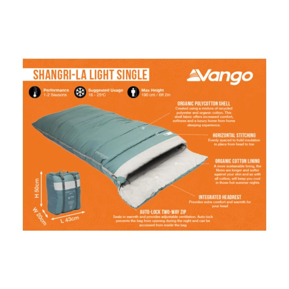 - With a tog rating of 5.5, the Shangri-la Single is ideal for one to two-season usage, from Spring to Summer, with a square design for a more spacious feel to the bag.